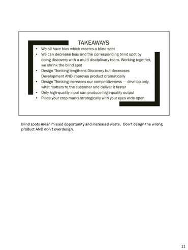 We were limited to 10 unique slides. I favored graphics in my Design Thinking slide deck. I drove points home with war stories. I copied graphics from the web to create a raw, authentic feeling aligned with the unconference. If I were presenting at a polished conference, I would have used a polished deck.